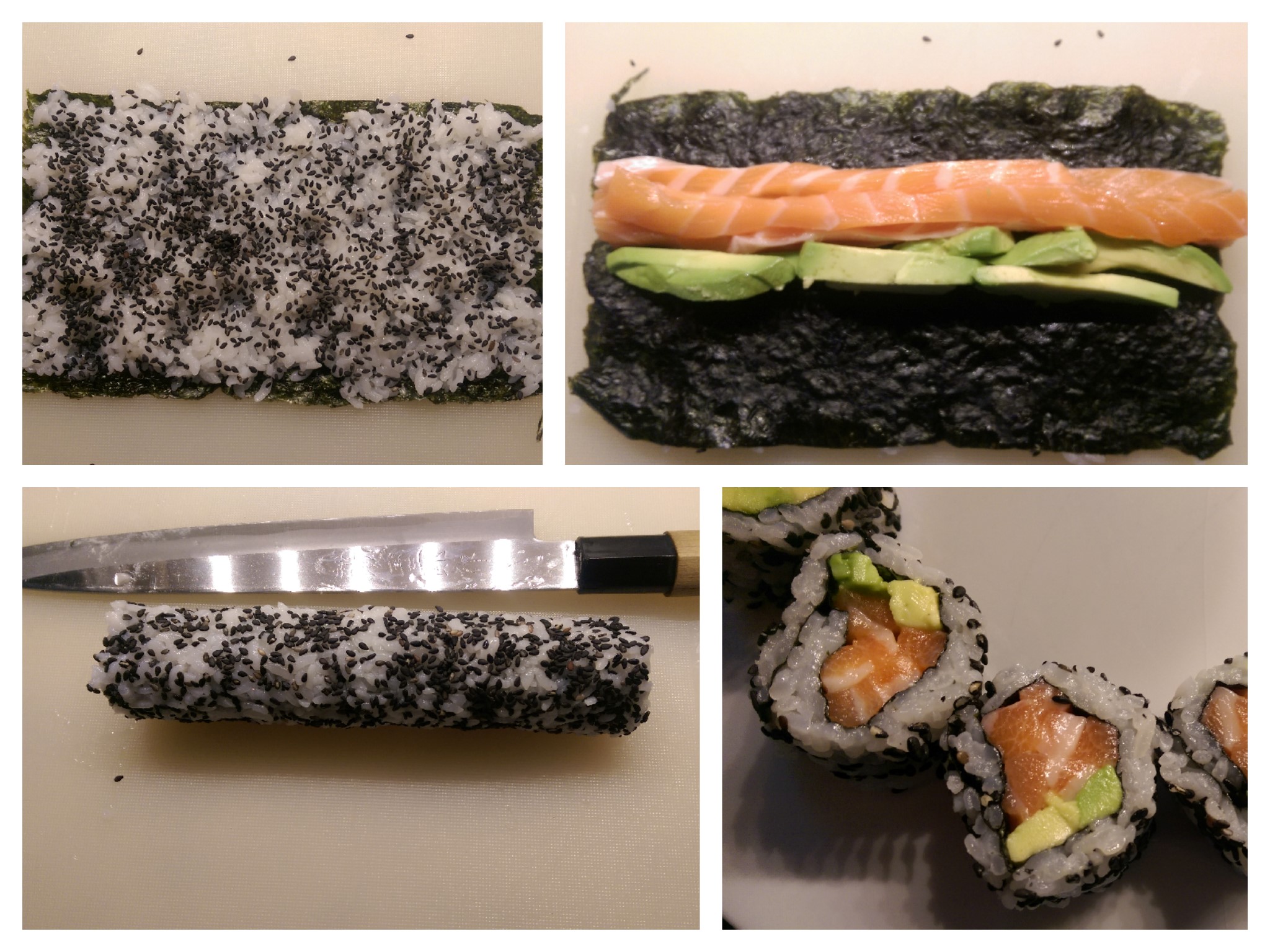 Salmon Avocado Maki. Use the same technique but now add Salmon + Avocado strips before rolling the Maki. Sesame seeds dusted on the outside add crunch and flavor.