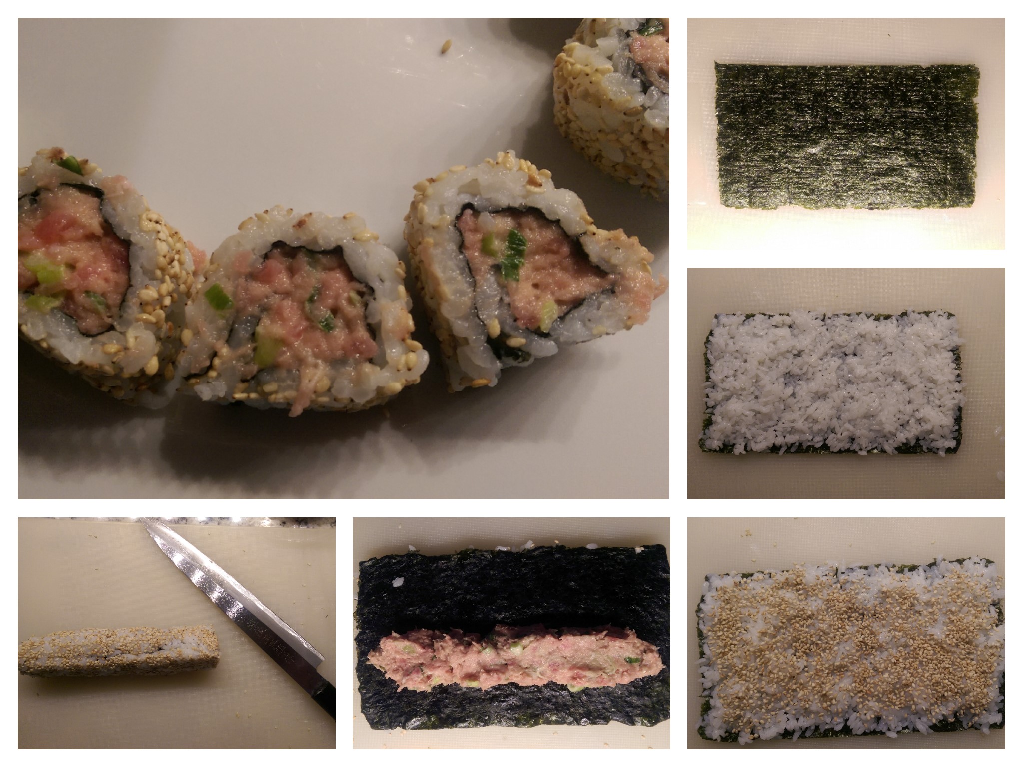 Spicy Tuna, use minced tuna, Japanese Mayo, a hot pepper sauce and green onions. Mix the ingredients in a bowl. Follow the steps in the pictures to the right (clockwise from top right corner), using a wooden rolling sheet to form the rolls.