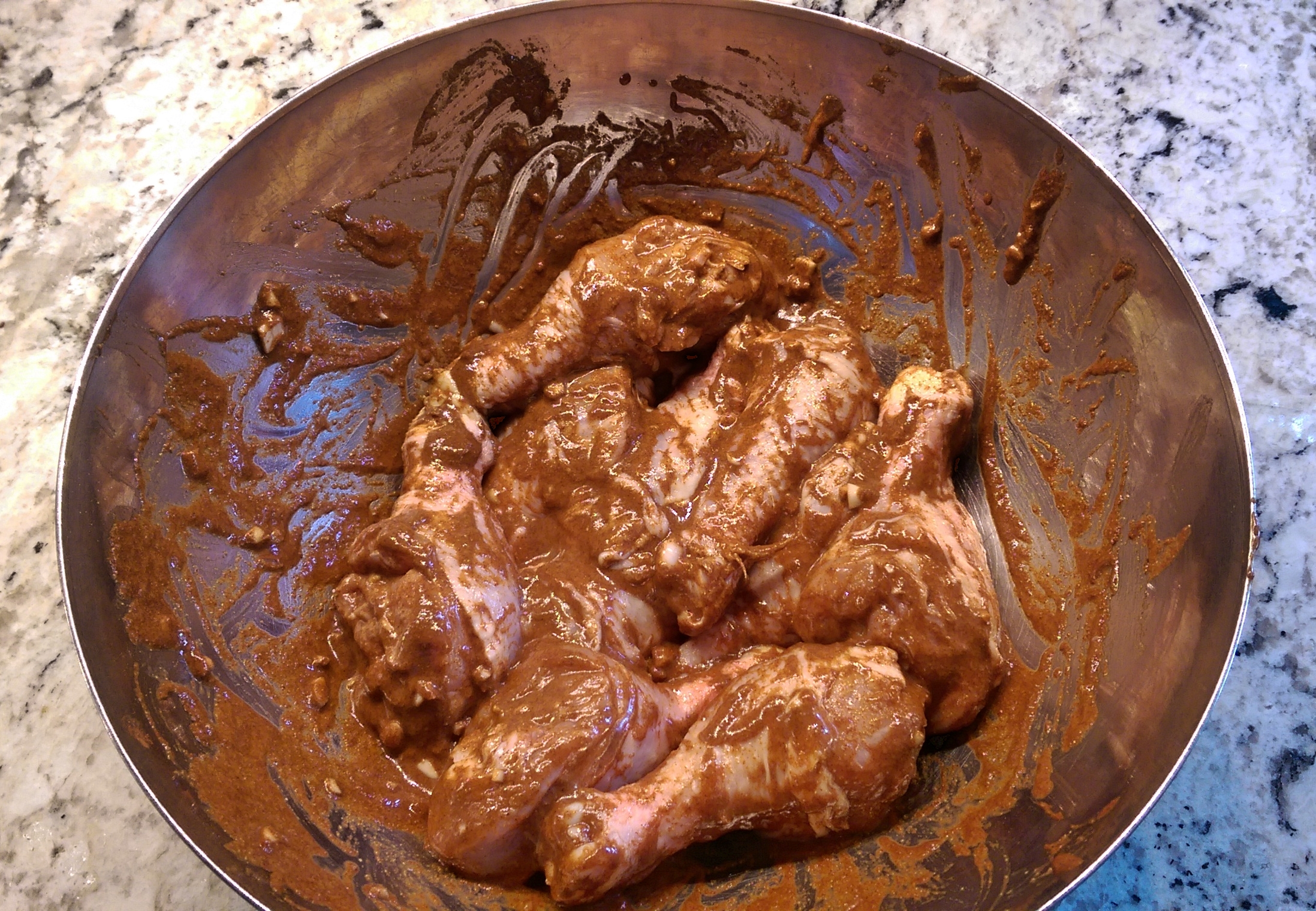 • Now drop those Chicken legs into the bowl, rub the mix all over them and refrigerate for a few hours, or overnight (5 mins or 2 hrs+ it’s up to you!)