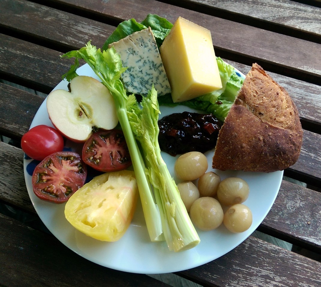 A couple of chunks of different cheese – I often use Cheddar and Stilton but this time I used Rupert from Vermont and a Colston Basset Stilton from England – 2-3 tbsps of Branston Pickle (a chunky chutney that just works marvelously with cheese – I promise!) and a handful of pickled onions (both the pickle and onions are available online at Amazon and in local stores that stock British produce), Heirloom Tomatoes, Celery, Lettuce, an Apple and last but not least a hunk or two torn from a tasty hand made bread