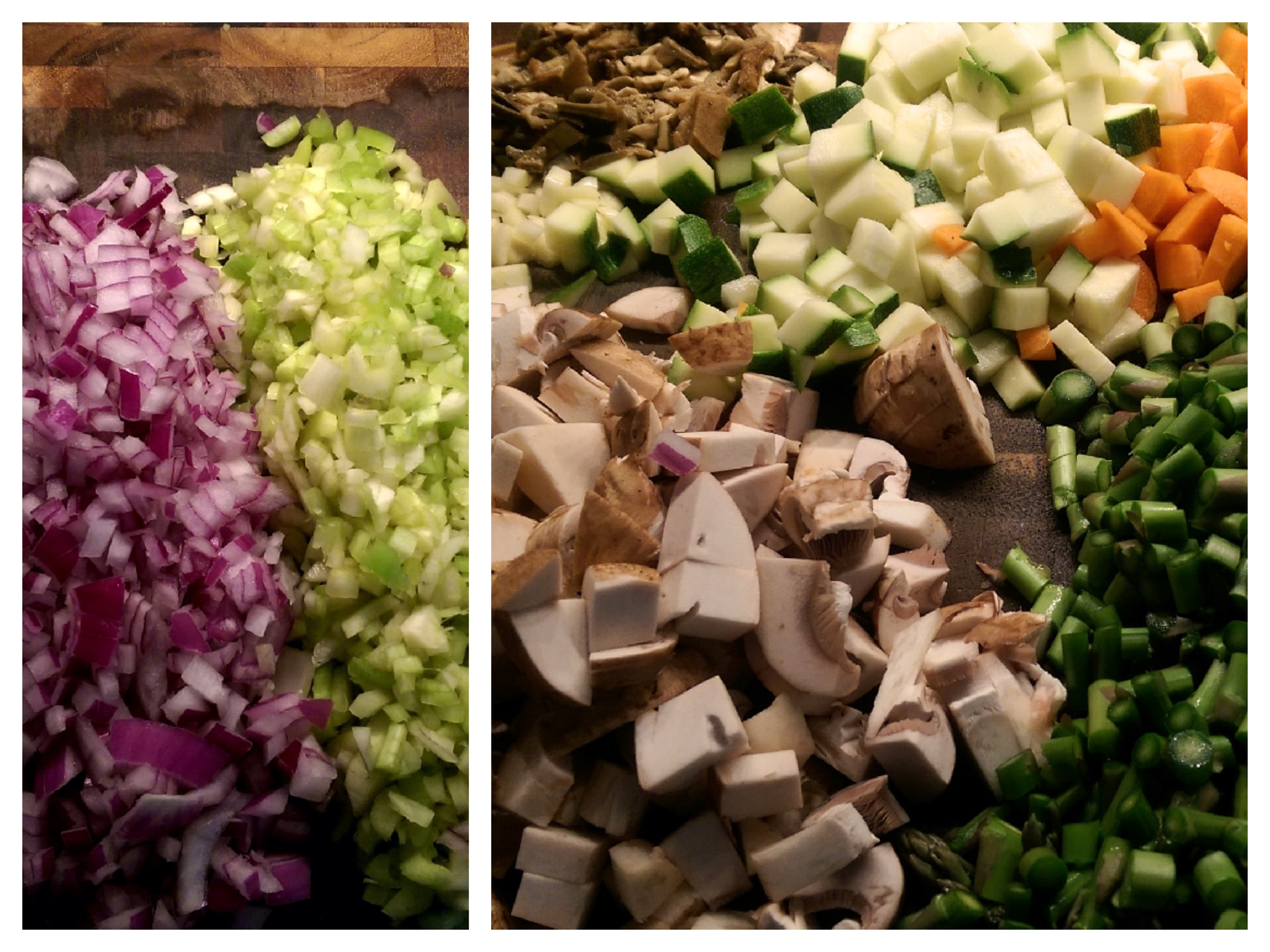 - Roughly chop the asparagus, carrots, mushroom and zucchini into 1/4 inch (or smaller) pieces
