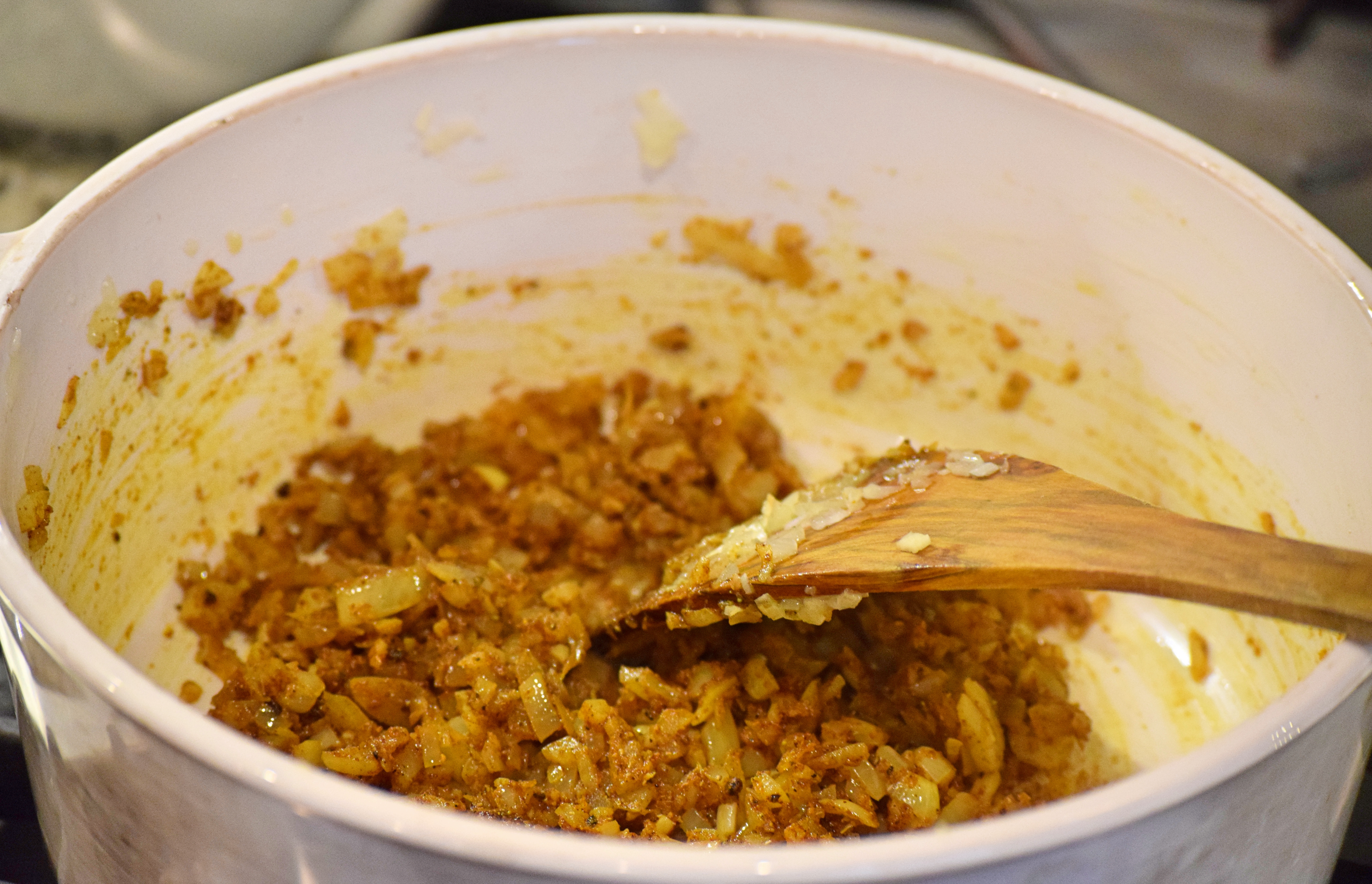 - Saute the onion in a casserole dish for 5 minutes until it softens adding the garlic and all the spices, stirring for a further 2 minutes