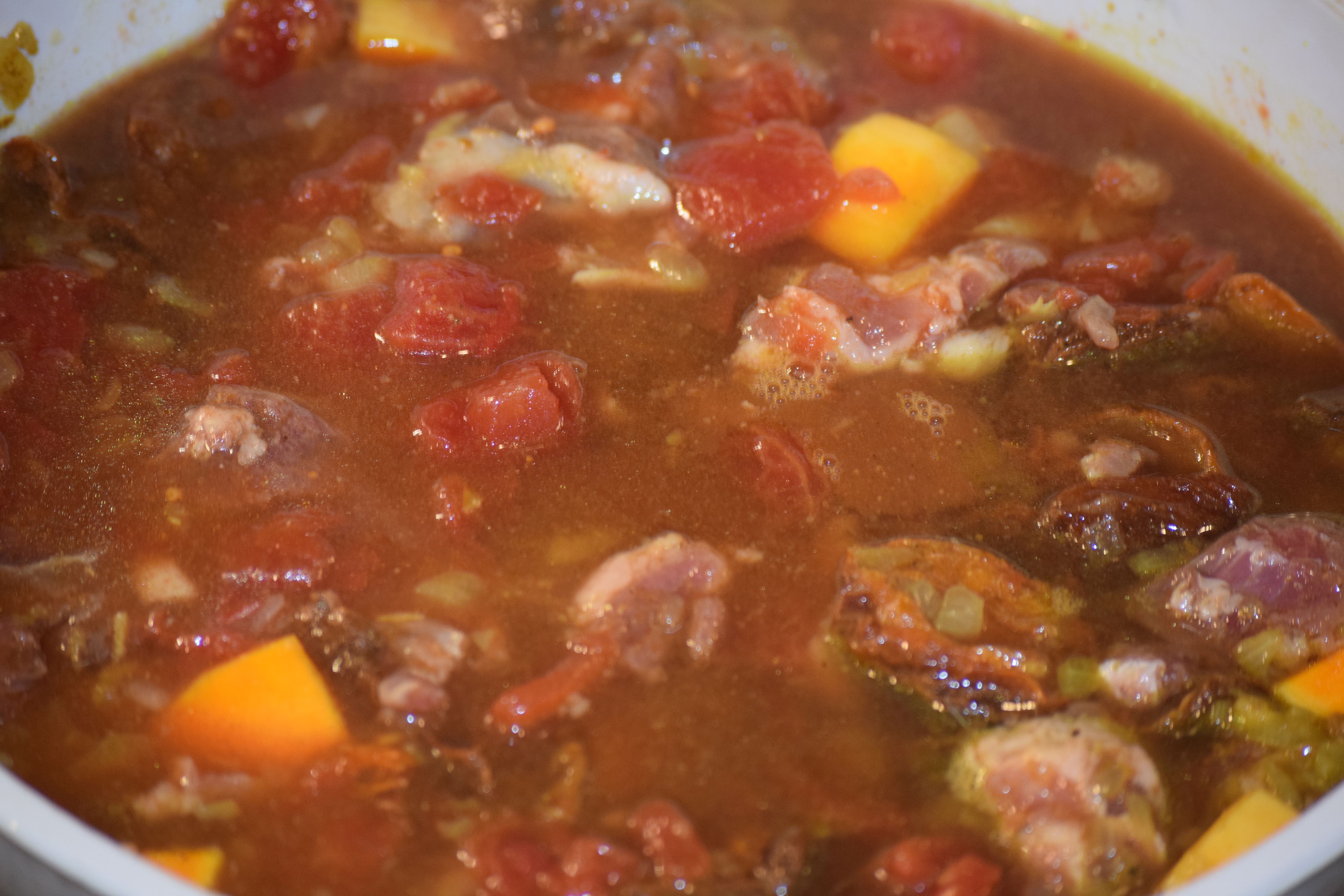 - Then add the lamb, squash, tomatoes and stock season and bring to the boil. Cover with a lid and place the casserole dish in the oven for one hour.