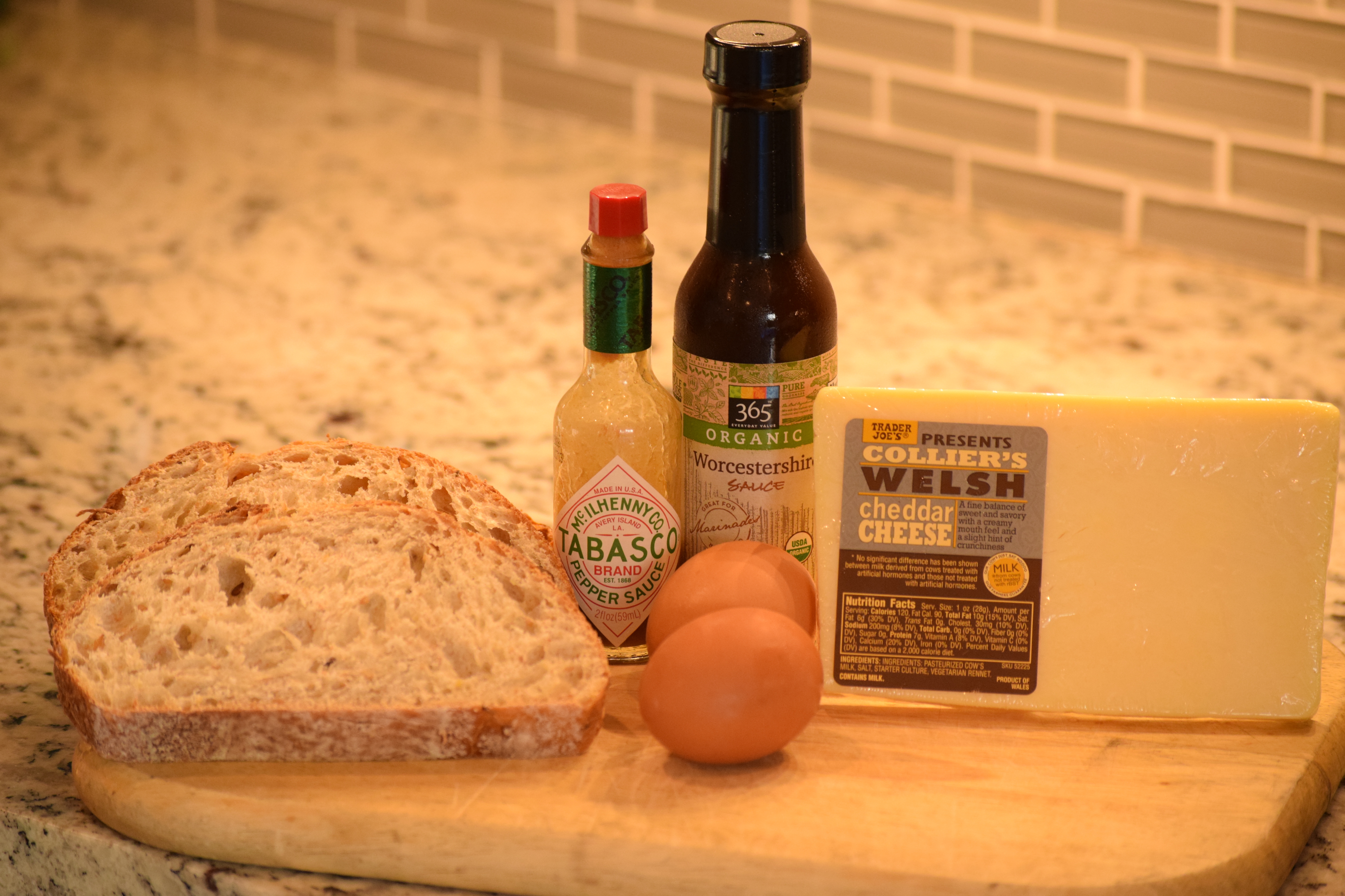 2 oz cheddar cheese – I bought Colliers Welsh Cheddar, which has a sweet, creamy crumbly texture and can be found in Trader Joes and De Ciccos here in NY , a couple of thick rough cut slices of artisan whole grain bread, 2 eggs, a 1/4 tsp of Worcestershire sauce, and a few drops of Tabasco sauce (if you’re feeling in the mood)