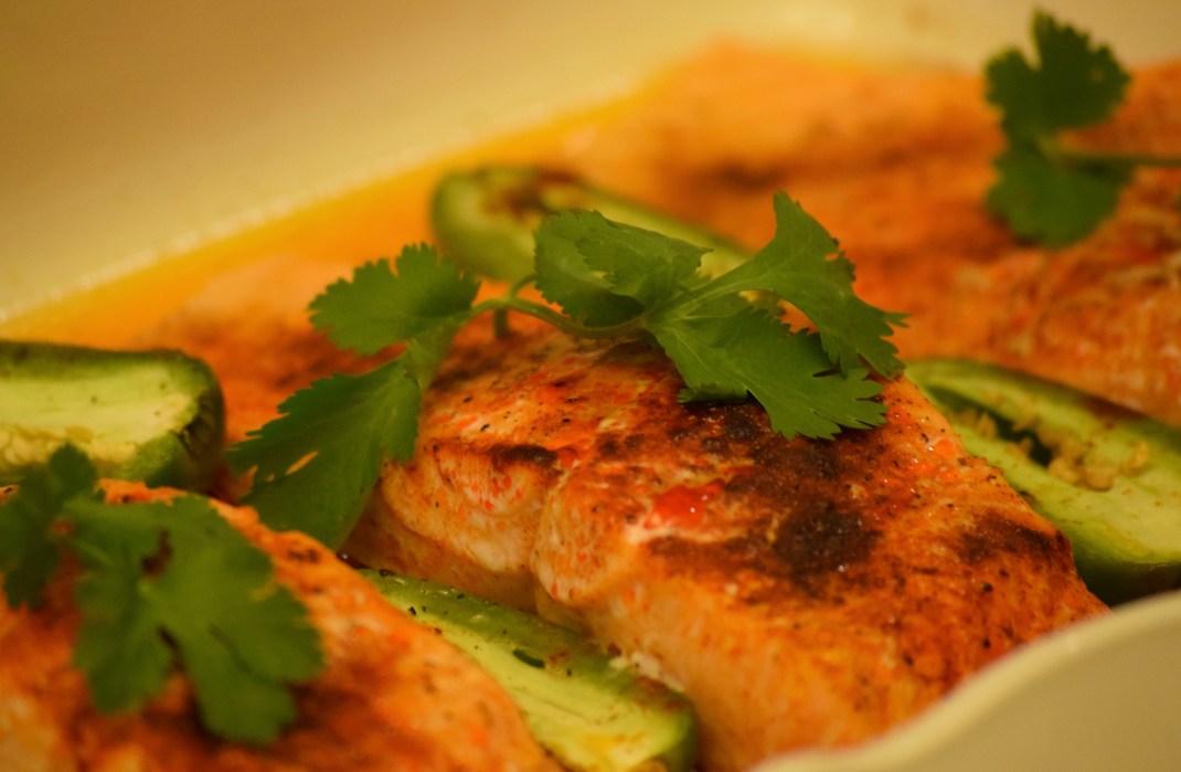 - Lay the salmon in the oil flesh side up and place the jalapeno peppers seed side up alongside each salmon slice
