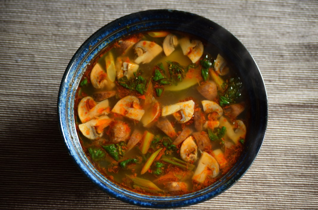 After braving the crisp outdoors this morning, I made a batch of this Thai soup and boy, did it hit the spot! If you are a fan of chili and lemon like me, this is the soup for you. The combination of crunchy vegetables, exotic lemongrass with its strong citrus tones and the hot sour flavors of the Tom Yum paste topped with fresh cilantro just do it for me every time