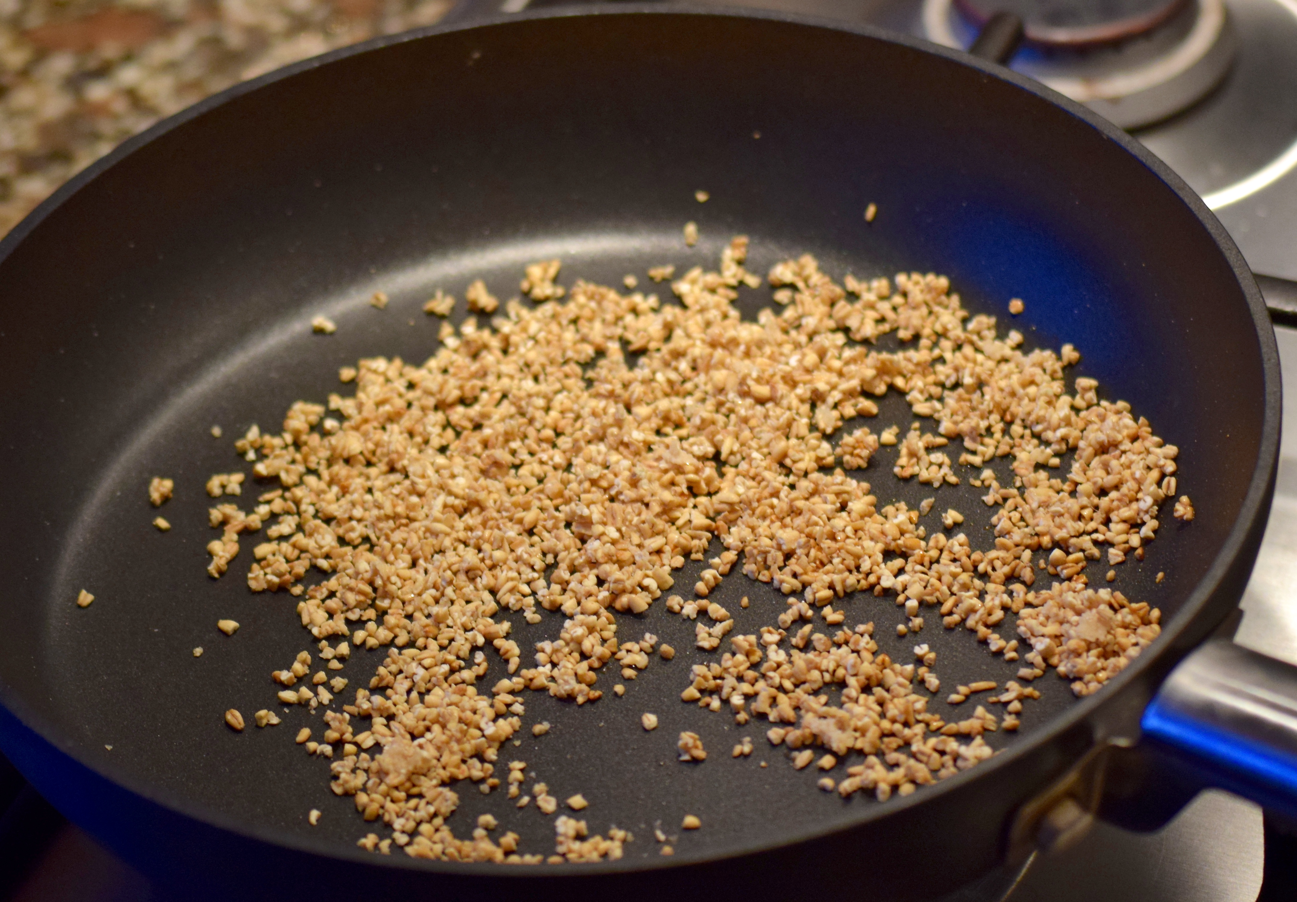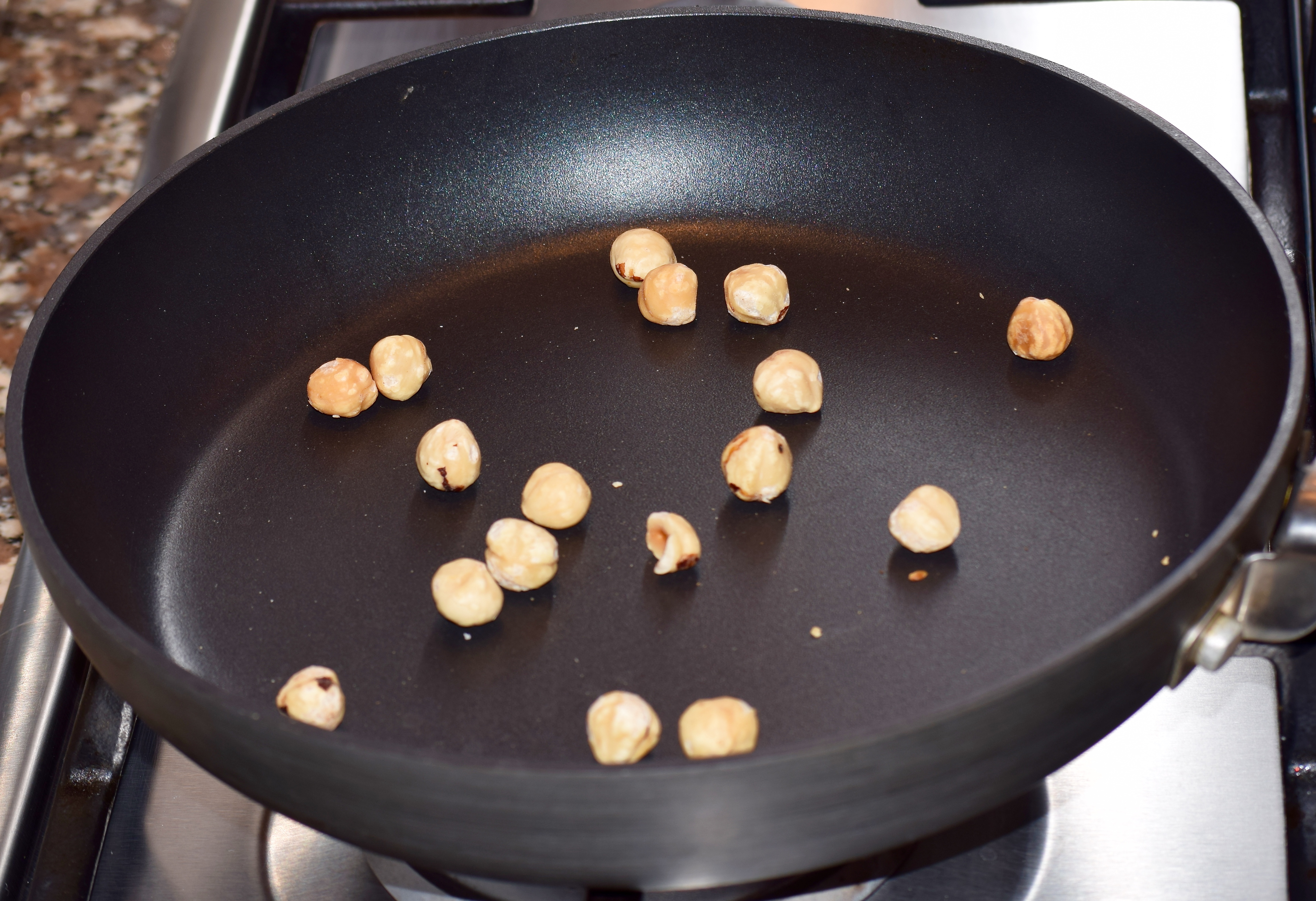 - Heat a frying pan to a medium heat, toast the hazelnuts for 3-4 minutes and keep rolling them around the pan so they don’t burn