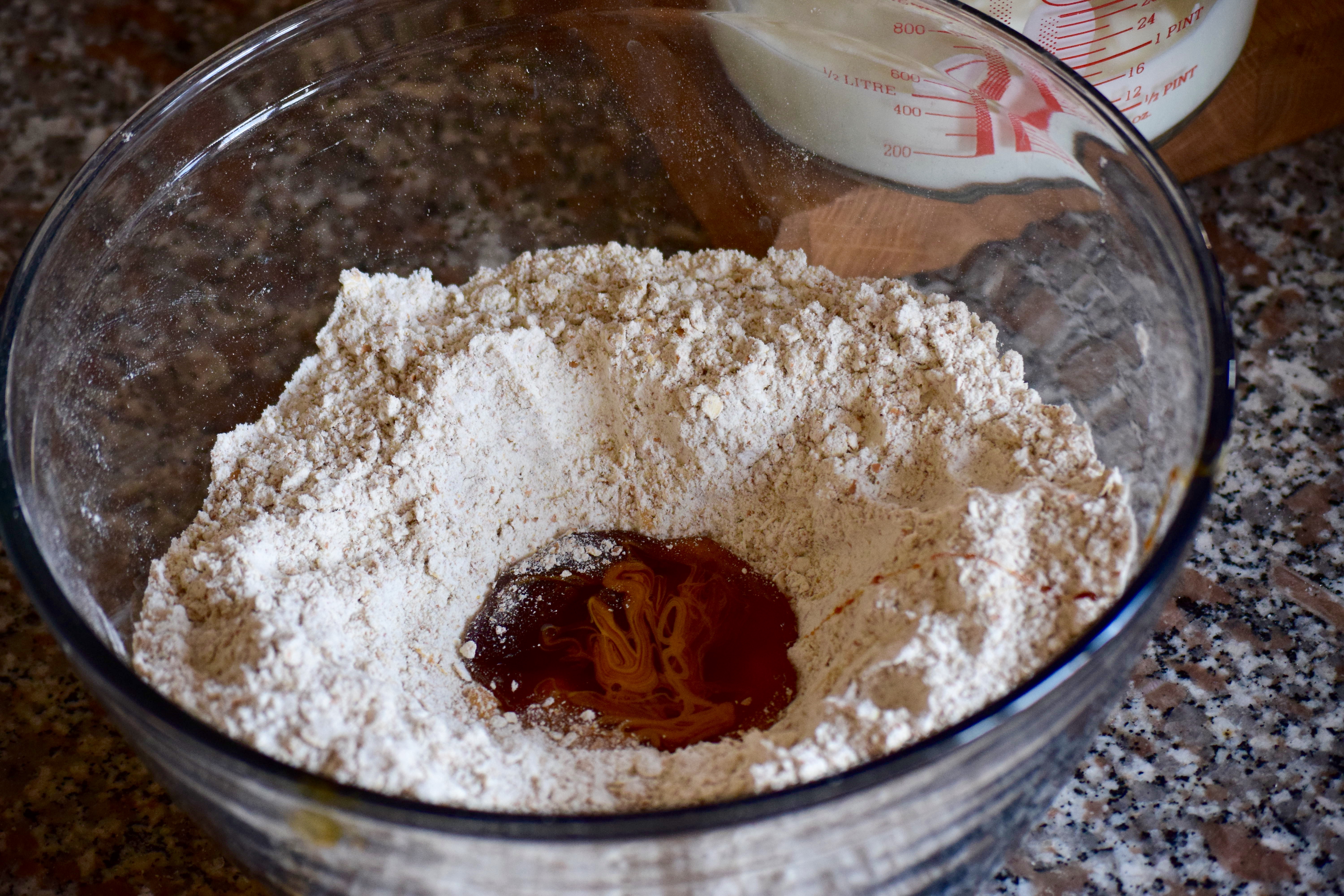 - Make a well in the centre, add the buttermilk, malt extract and honey