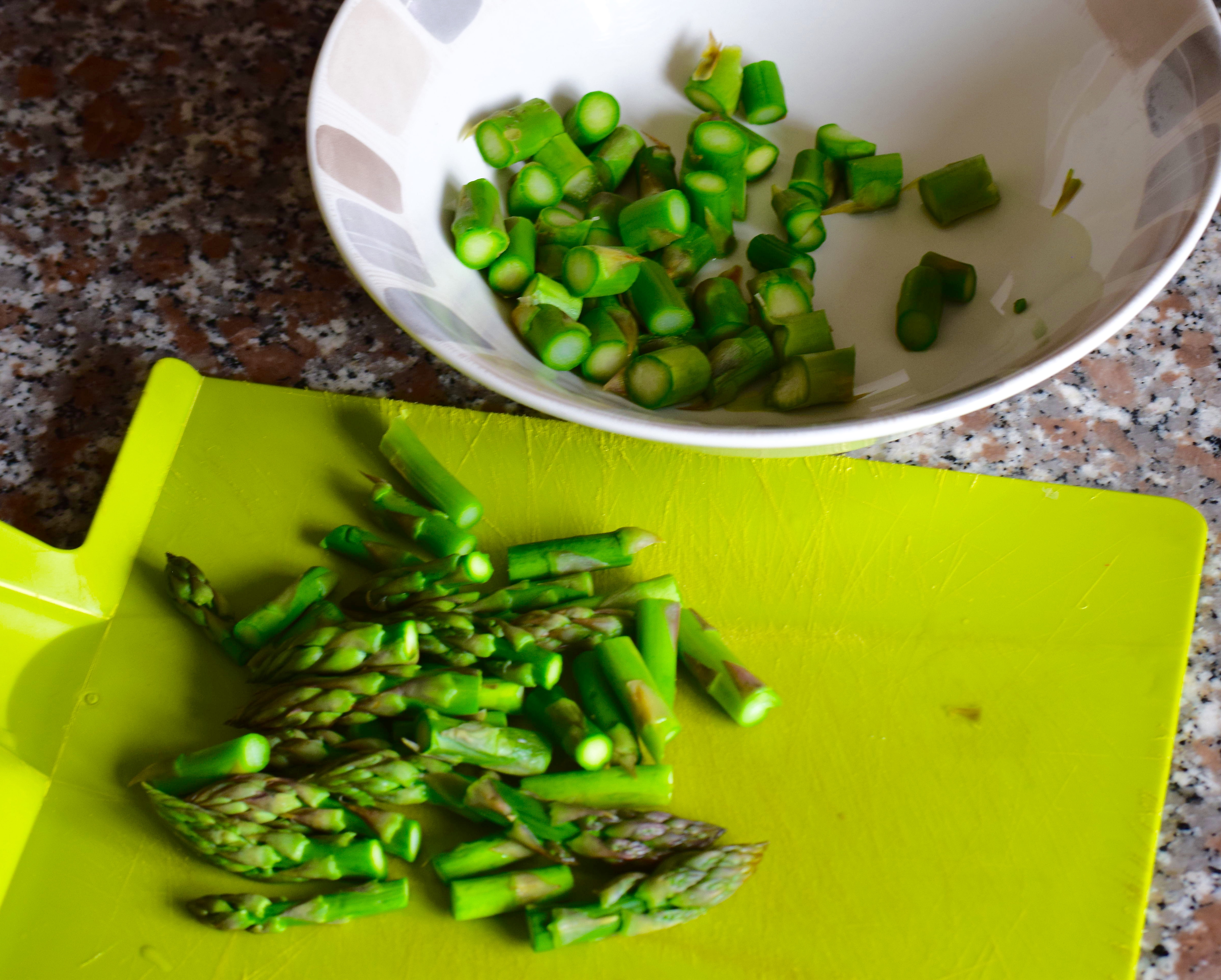 - Chop the cooked asparagus into 2cm (3/4 inch) lengths, retain all the tops, and puree half the stalks in a food processor