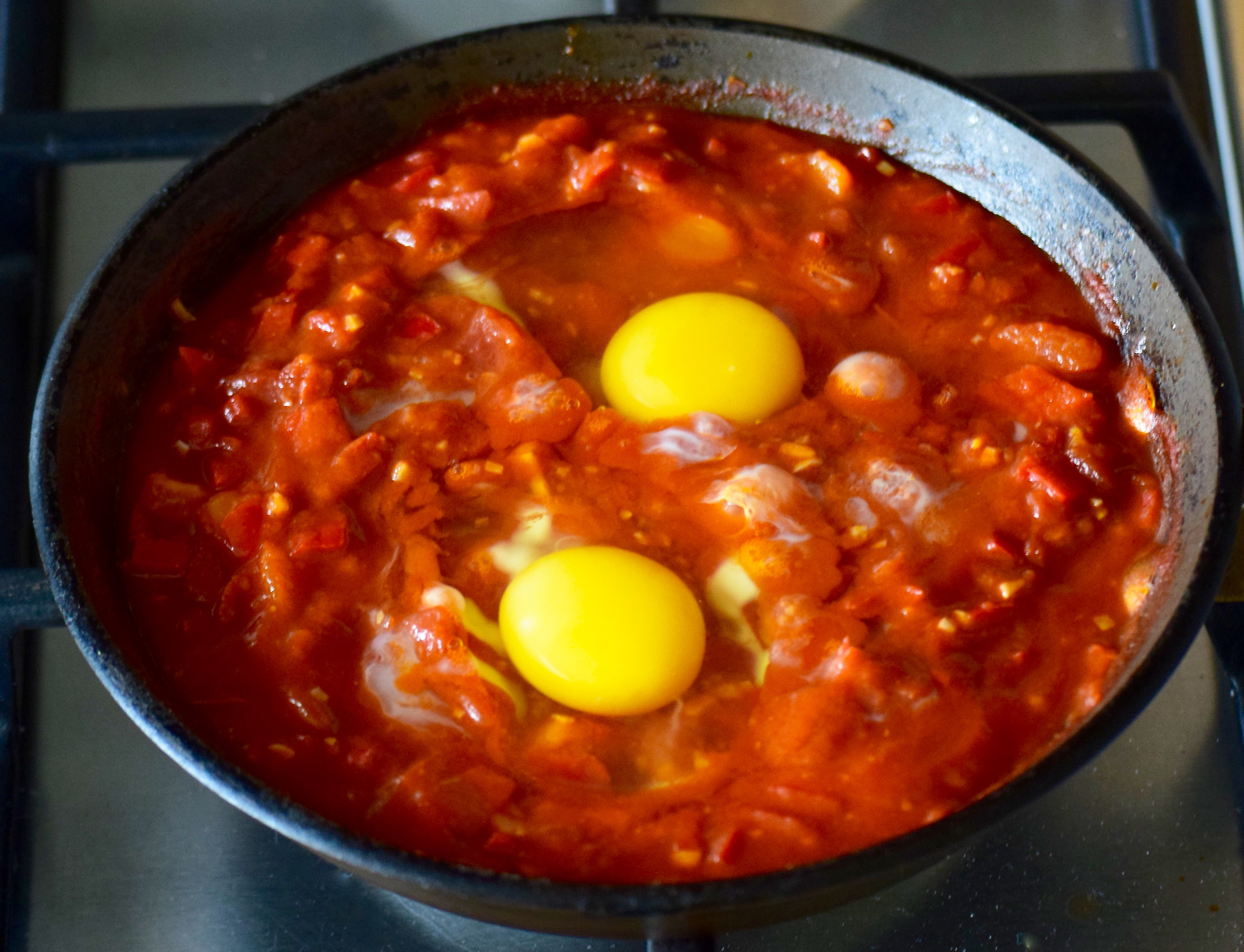 - Make a dip with a spoon and carefully break the eggs on top of the sauce
