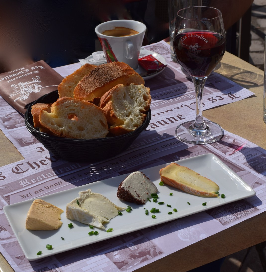 We sat next to a table of locals demolishing plates of snails & seafood, washed down with some local wine & boisterous banter. I opted for the selection of cheeses (picture at the top of the post). They were all delicious with the highlight being a local creamy cheese rolled in fine crumbs of gingerbread from Dijon (picture below right).