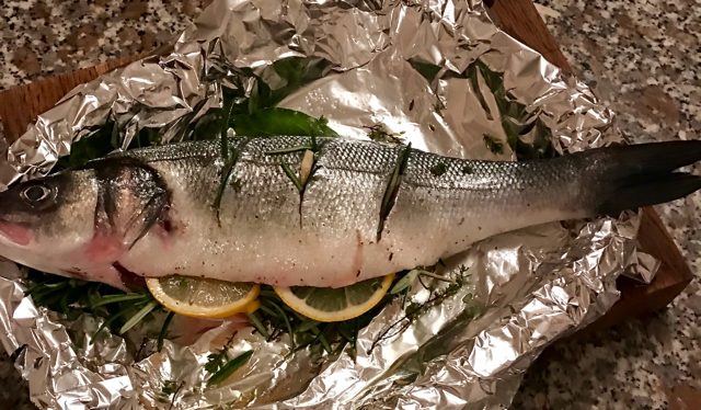 - Fresh whole sea bass, cleaned & gutted, leaving head & tail on( a small one serves 1, medium for 2)