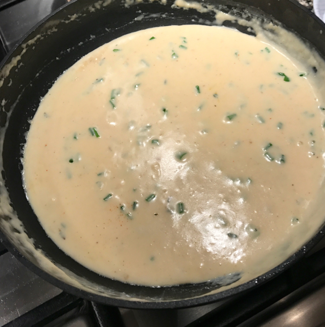- Add 2 tablespoons of the grated cheddar and a teaspoon of fresh chives, stir into the sauce until melted & incorporated.