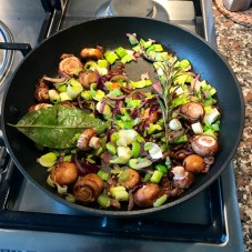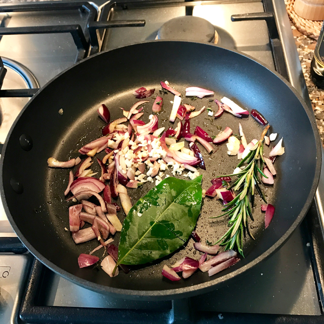 - Sauté the onion, thyme, rosemary & bayleaf in 1 tablespoon of oil on a gentle heat for 5 minutes in a frying pan until soft without colouring