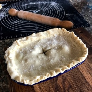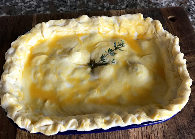 - Add the pastry lid, carefully, crimping the edges, trim any excess pastry over the edge