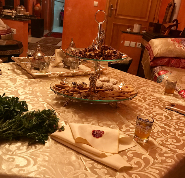 The last meal, and the most special, was at Aziz & his wife Atika’s  home – an authentic Moroccan experience. We sat in their sumptuously decorated Moroccan salon, with beautifully carved furniture hand crafted by Atika’s family.