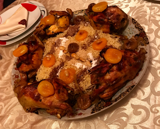 We had a wonderful meal of Seffa –  chicken with vermicelli, an onion sauce with almonds, apricots, figs, raisins, decorated with a sprinkling of cinnamon.