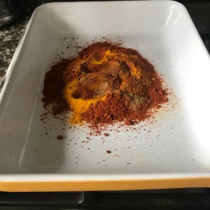 Mix 1 teaspoon each of cumin, ground coriander, cinnamon, turmeric, sweet & hot paprika & Ras El Hanout & coat the lamb and rub in. Leave in the fridge for at least 4 hours and ideally overnight.