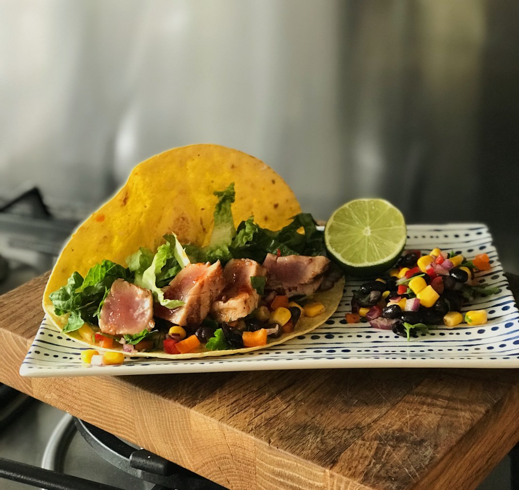 In taste2taste style we have come up with our tasty fresh tuna taco’s recipe. It’s easy to make and pairs perfectly with the Habanero Lime Jelly condiment, with its great balance of sweet red peppers, lime citrus tang with a warming kick of Habanero chilli. We have served together with our taste2taste take on ‘cowboy caviar’ – a veggie combo of sweet corn, black beans, mixed bell peppers as a salsa/side. You’ll find the original recipe in our blog archives via the following link:
