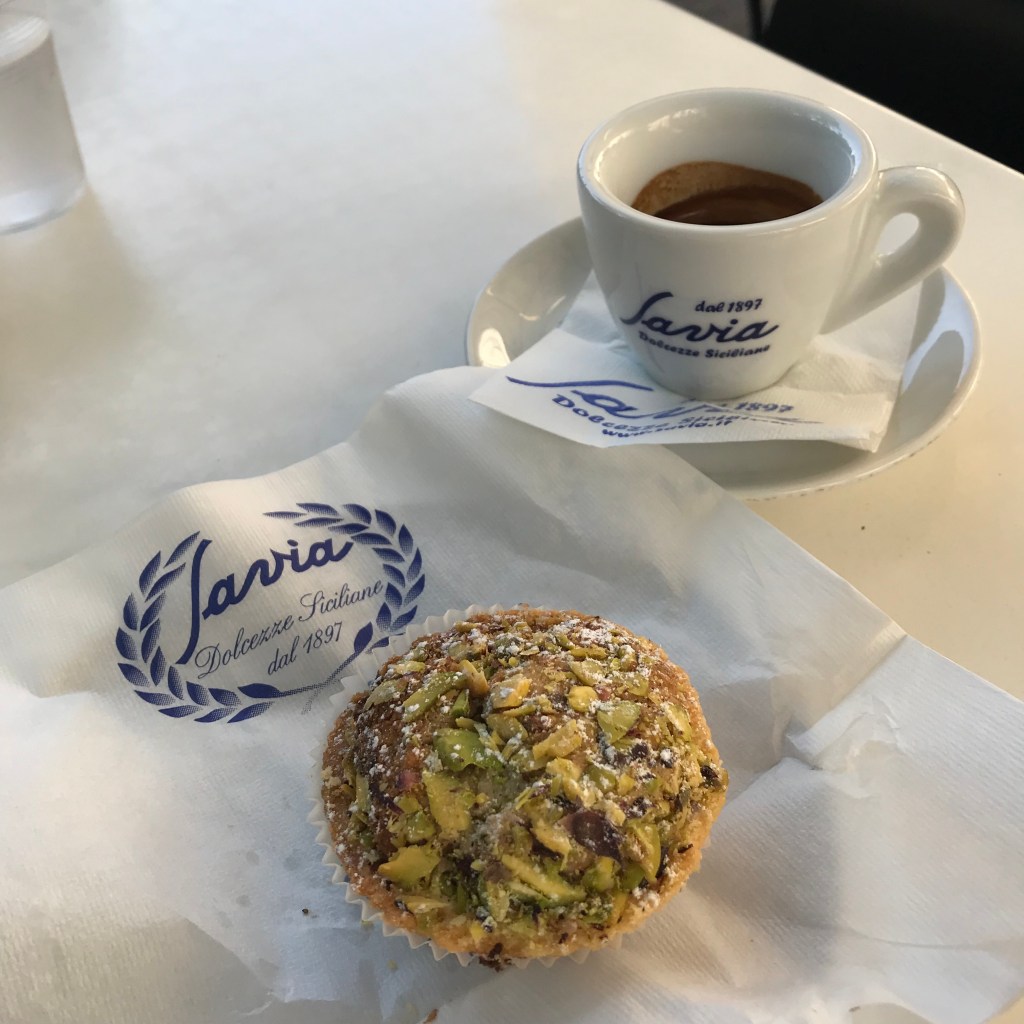 Pistachio pastry and an espresso at Pasticceria Savia, Catania