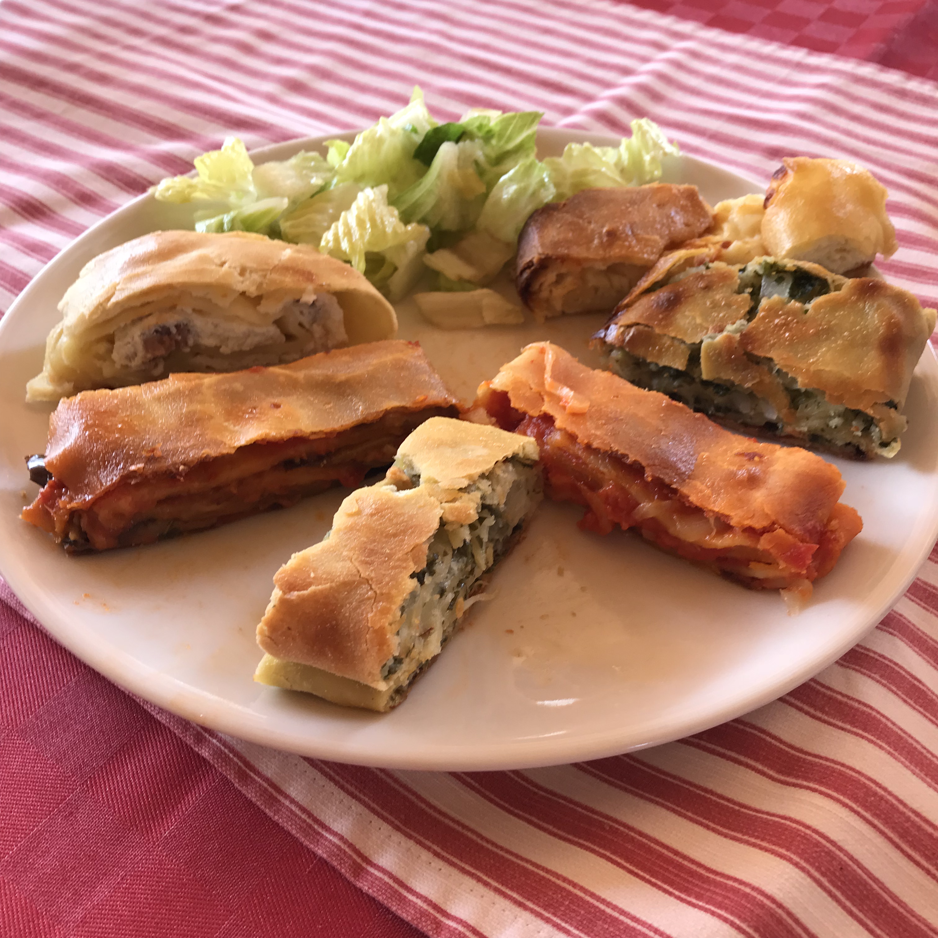 One of my favourites was  Scacce  Modicane – a savoury thin  pastry filled with various fillings including ricotta & sausage; tomato, aubergine, basil; potato, parsley & onion with some local casiacavallo cheese then  rolled up like a Swiss roll & baked.