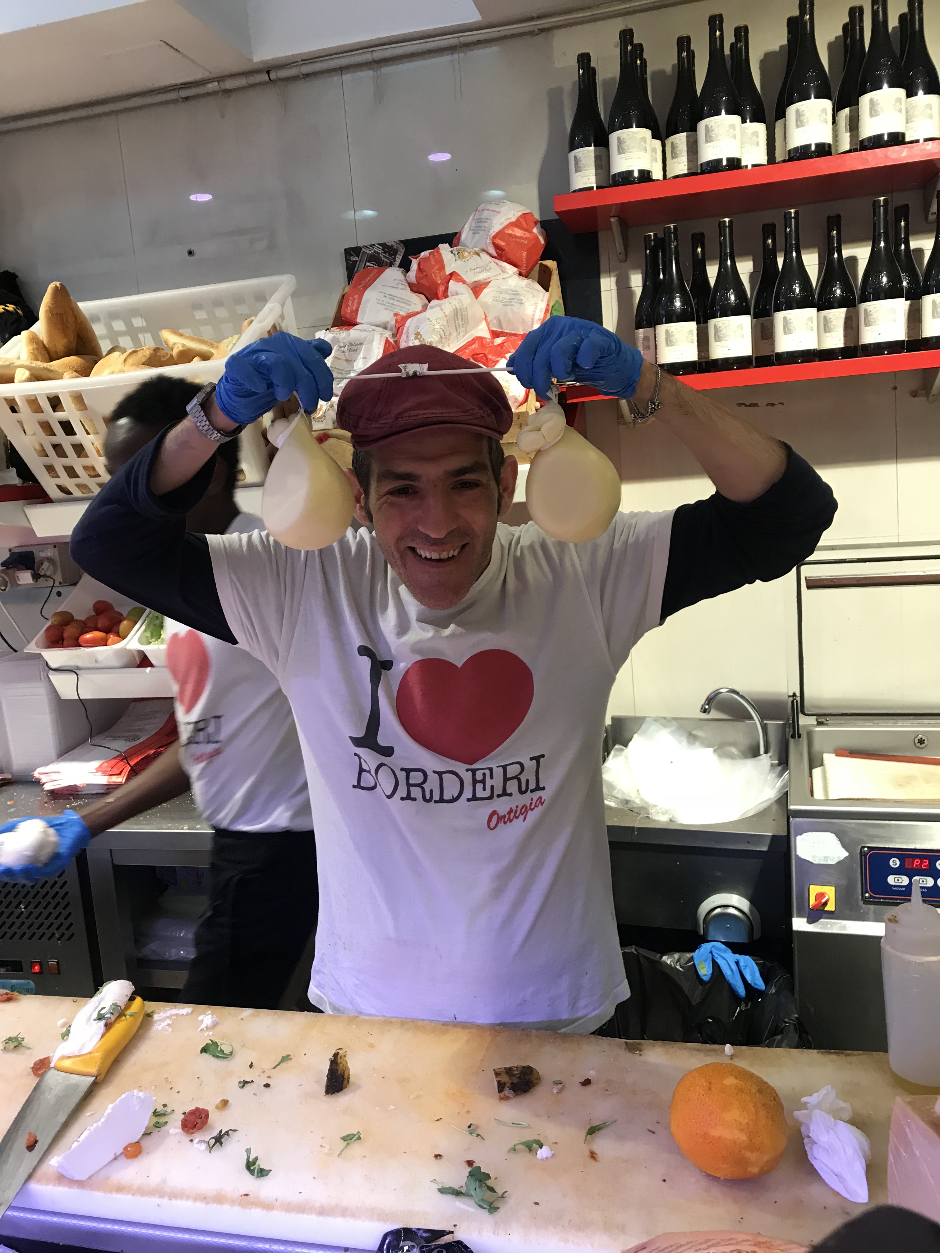 He had Italian charisma, flirting and  plying us with samples of his triple baked ricotta and pecorino with peppercorns. A great character and very effective salesman as we all ended up buying lots of cheese.
