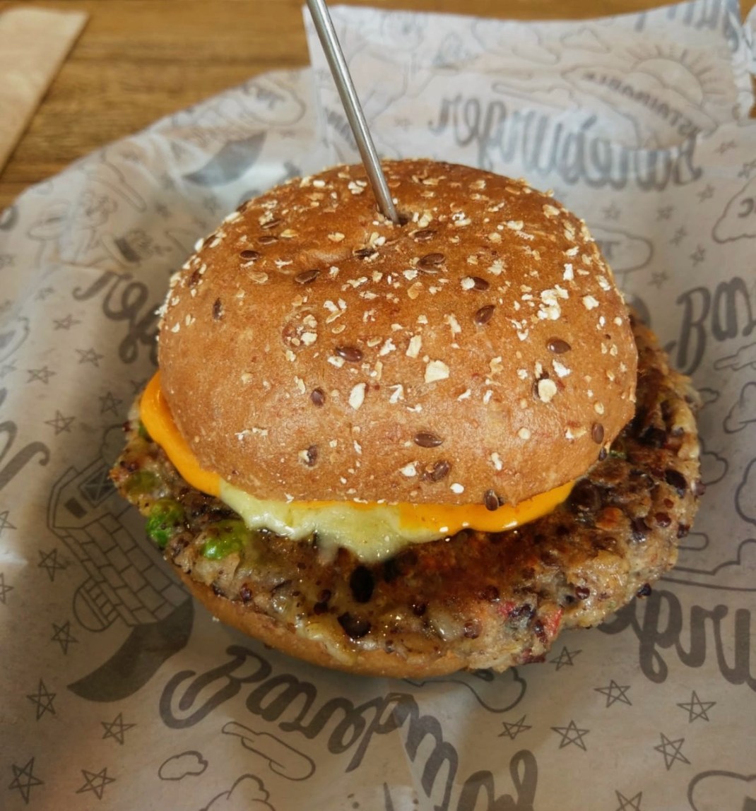Thai Chia: quinoa, chia & green pea patty, vegan American cheese, caramelized onions, 7 spice Thai ketchup in a sprout bun ( no mushrooms or spinach)