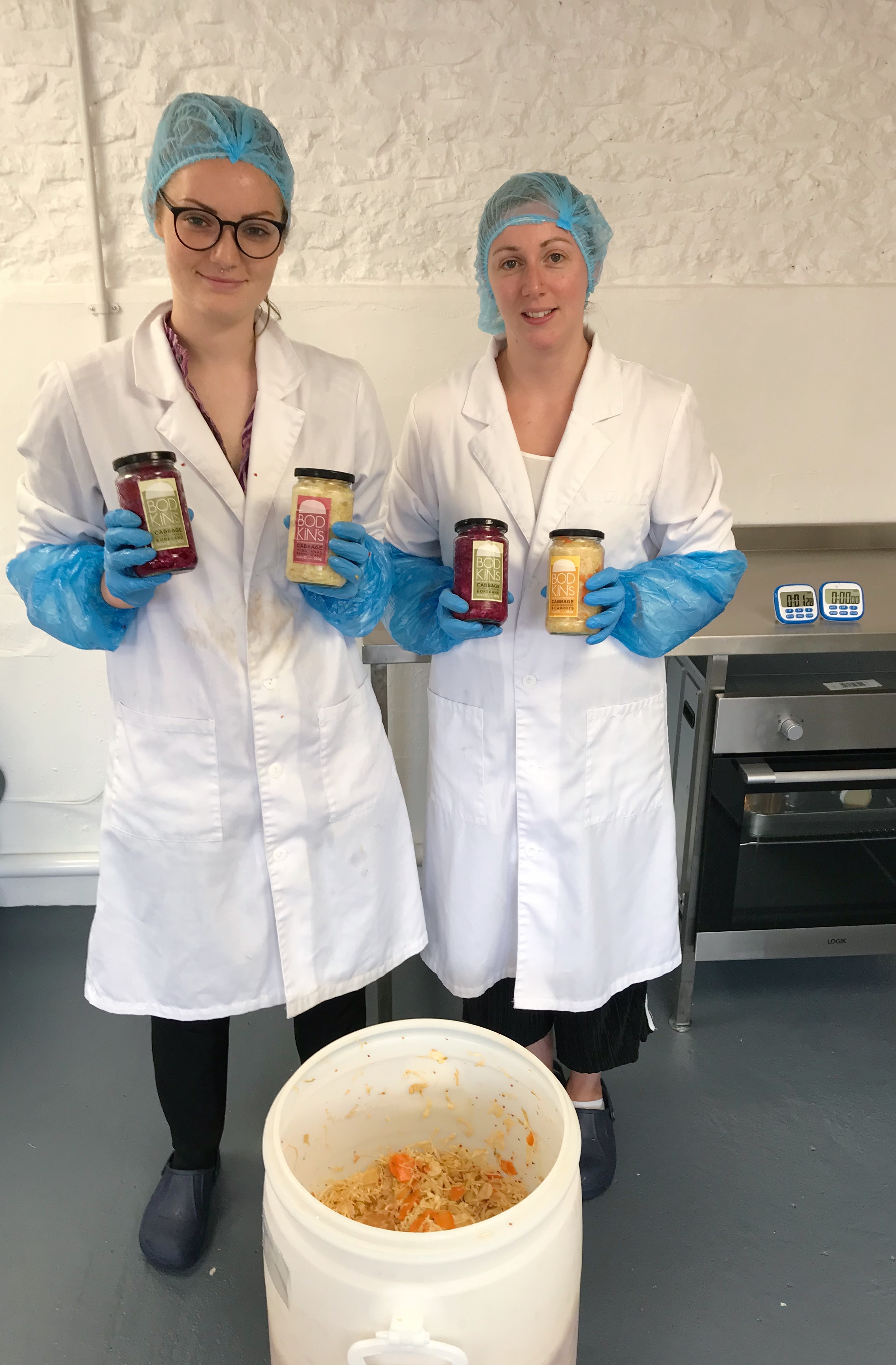 Simon and I continue our series of posts on all things fermented and pickled. We have discovered some great new products at the Food Shows we’ve visited in the USA & U.K. At Food Matters Live – a UK Food Show with a Health & Well-being focus, I met up with Jessica Herridge, Founder of Bodkin’s. After trying her tasty range of unpasteurised, fermented vegetables I was interested to find out the story behind their creation. Jessica’s son had experienced digestive health issues after being prescribed multiple doses of antibiotics. She had read about the benefits of gut friendly foods in the diet and began to experiment at home with naturally fermenting different combos of vegetables and spices. Jessica incorporated the probiotic fermented veggie mixes into her son’s diet and after a few months his digestive problems disappeared. ‘Mum’s fermenting again’ with vegetables ready for shredding and jars around the kitchen becoming an ever familiar sight. Family and friends enjoyed the products too. They encouraged Jessica to take the next step and start making more to sell to the local community in Surrey. Inspired by her son’s improved health and the benefits of probiotics Jessica created Bodkins. In May 2019 Bodkins moved to a small production facility on Pierrepont Farm in Frensham, Surrey. The dairy farm had set up a trust to support local food entrepreneurs. Along with Bodkins there is also a small craft brewery and a cheese maker- so a thriving fermented food community! I met Vicky & Anna, the Bodkins production and sales team.