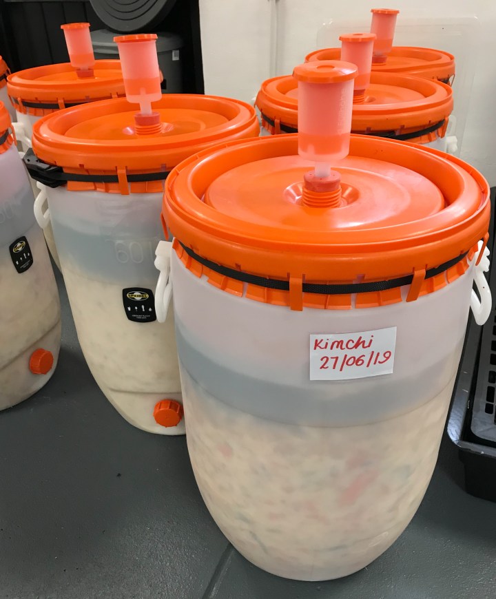They prepare the vegetables using a small industrial slicer, add salt and spices, then ferment in 40 kg barrels for 3 weeks. The lacto- fermentation that occurs encourages the gut friendly bacteria to grow and also preserves the product.