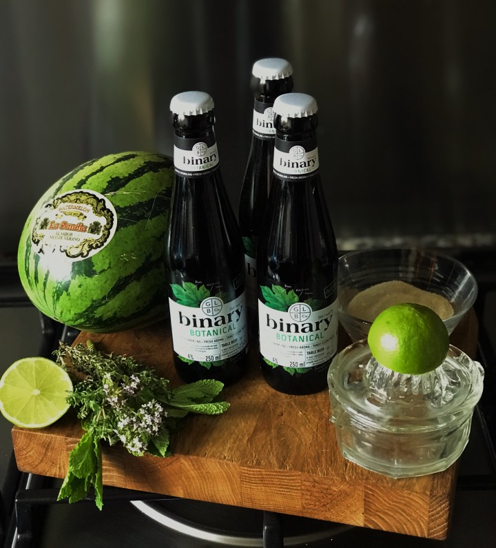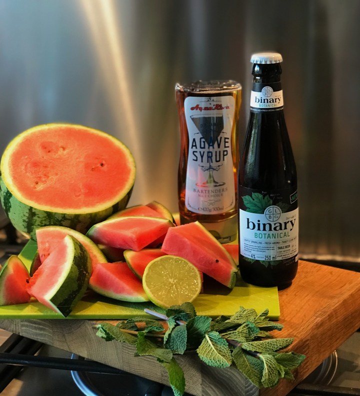 1 x 250 ml bottle of Binary Botanical or alternatively you could use Prosecco. If you want to make alcohol free just add 250g of extra watermelon.