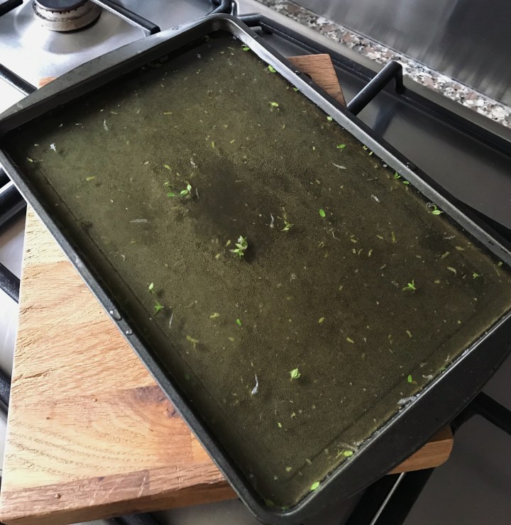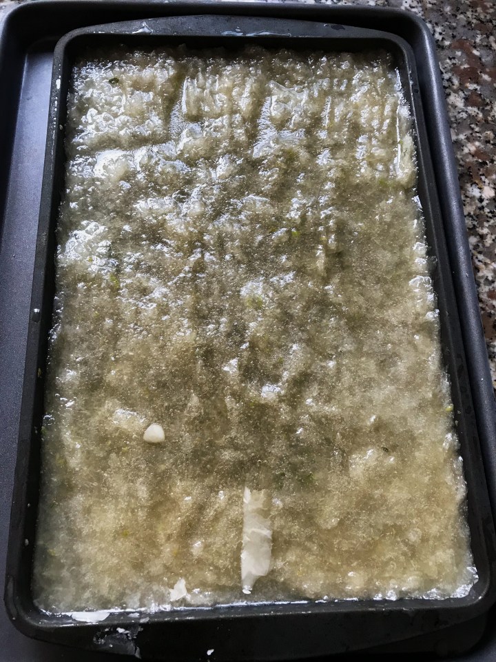 Add the Binary Botanical ( or tonic water & gin , if using), lime zest and juice and stir to combine. Add this to a shallow metal baking tray.