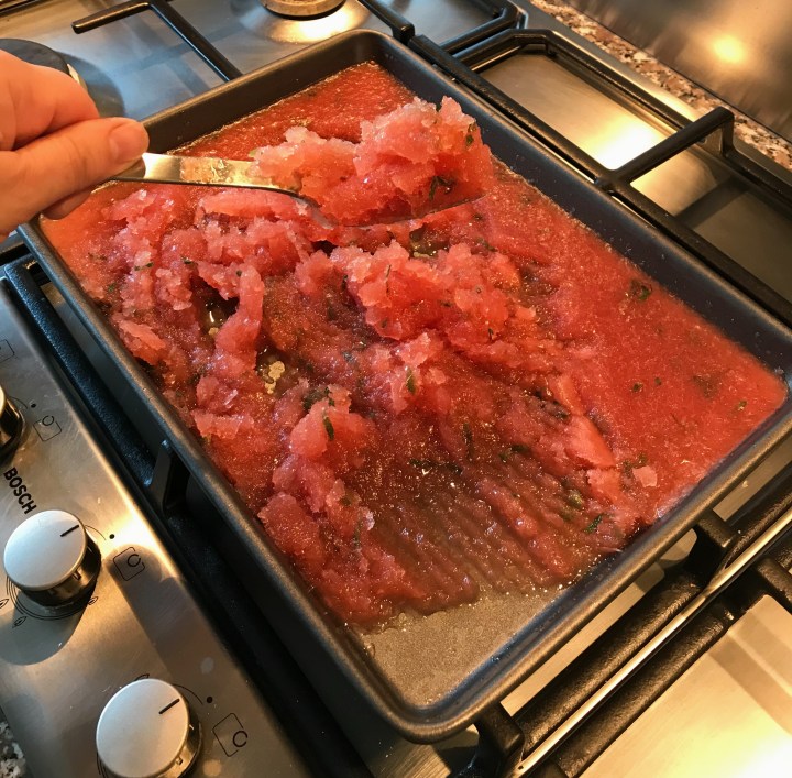 Put back in the freezer, freeze for 30 minutes and repeat 3 times so the granita is made after 2 hours of freezing and forking the mixture.